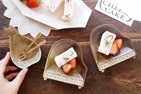 幼少期から大学までピアノを習っていて、ピアノの先生のお家にある大きくて存在感抜群のグランドピアノに憧れを抱いていたんです。ピアノを辞めてからは、グランドピアノを目にするのは演奏会などに限られてしまい、遠い存在に。。。なので、待望の「グランドピアノの器」が焼きあがってきた時、思わず大興奮。グランドピアノへの憧れが、テーブルの上で叶えられる!とウキウキしました♪まずは先生のお家のレッスン前に出てくる”ちょっといいおやつ” の思い出を振り返りながら…この器で苺レアチーズケーキを盛りつけておやつに♡