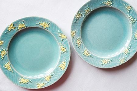 手作りの陶器には、細かい鉄点や凹凸、小穴があります。釉薬や黄色の着彩のムラや溜まりが見られ、釉薬が薄く素地の色が感じられる部分もあります。またミモザの黄色い釉の部分はひとつひとつ筆で仕上げている為、塗りムラが見られたり、釉が濃いもの、薄いものがあります。模様の出方も個体差が見られます。裏側は凹凸、道具跡が残っていたり、底面が黒く発色しているものがあります。お任せ発送となりますので予めご了承ください。