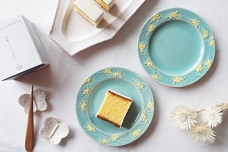 スーパーの地方菓子の企画コーナーでお洒落な箱のデザインが目に留まり、見てみると…ホワイトチョコレートがコーティングされている長崎のカステラで、なんとも美味しそうで購入して帰りました。開けてみると、雪をかぶったような白いカステラが出てきてうっとり。さっそく、「レイクグリーン ミモザの小皿」にのせてテーブルへ運ぶと、まるで春が始まる前の“雪解け”の風景を連想させとても素敵でした。またカトラリーレストとして
