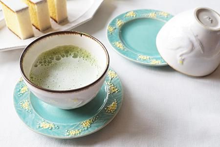 「brown line 白鳥のまるカップ<黄色の冠>」を合わせてみました。いつもの抹茶ラテが一段と美味しく感じ、ほっと癒しのひとときに♡小皿として、そしてソーサーとしても楽しんでみてください。