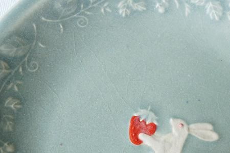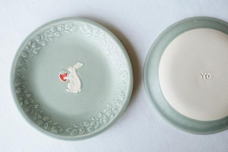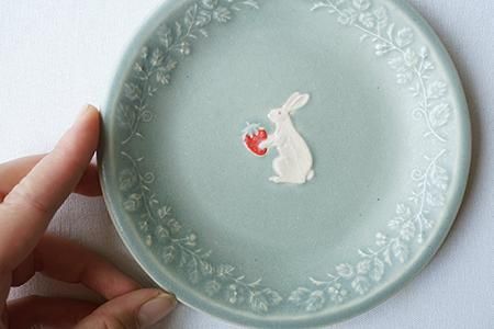 「薄緑(しっとり) うさぎと苺の小皿」は泥しょう作りという方法で生地を作っています。