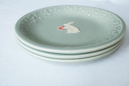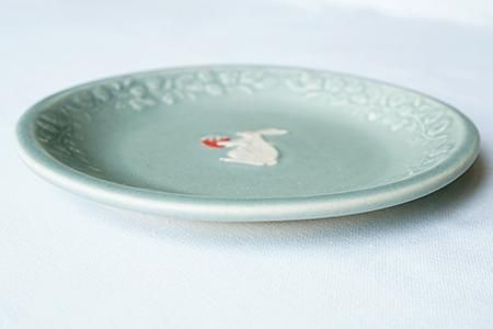 色は「薄緑(しっとり)」。少しツヤを感じるややくすみ系の淡い緑色で、落ち着いた雰囲気です。釉薬に含まれる成分が鉄点や青い点になって全体に見られ、釉薬の溜まりが分かる部分や、素地の白土の色が感じられる部分があります。「うさぎ」には白、「苺」には赤の着彩を施してアクセントをつけました。
