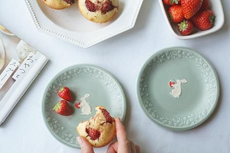 苺が美味しい季節。お安く買える完熟した苺を買ってきては焼き菓子に入れたりするのを楽しんでいます♪この日は川地あやかさんの「おやつとスプーン」の本から「いちごのせマーブルマフィン」を焼いてみました。苺スイーツの取り皿はやっぱりこの「薄緑(しっとり) うさぎと苺の小皿」で♡ マフィンが苺の蔦に囲まれているようで、苺好きにはたまらない見た目にうっとり!