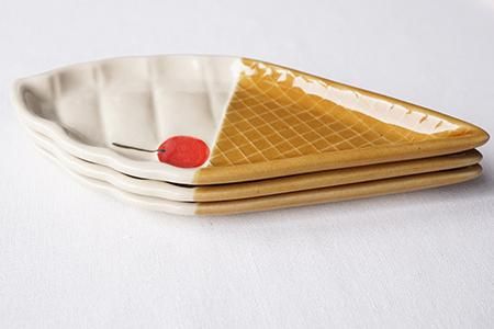 美味しそうなワッフルコーンの上にくるくると巻かれたソフトクリームをモチーフにした小皿です。サクランボが添えてあるところがポイントです♪