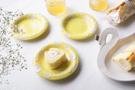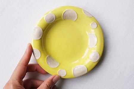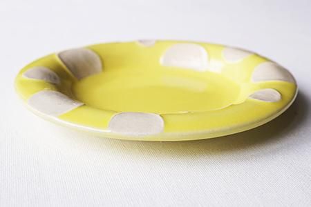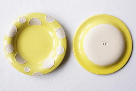 色は鮮やかな黄色、そして模様は白土の素地に透明な釉薬を掛けて白く仕上げ、黄色×白のビタミンカラーの可愛らしい印象に!
