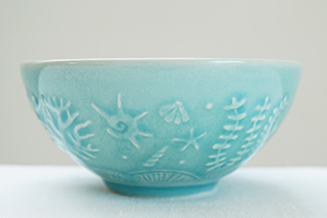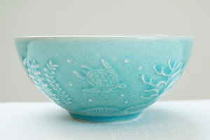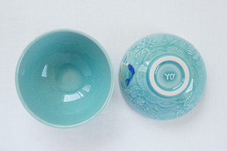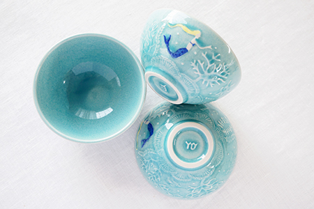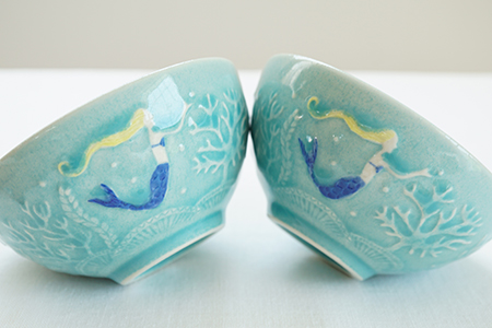 外側に凹凸で施した模様は、マーメイドにサンゴ、貝やヒトデ、海藻にウミガメ、そして魚たち。海の中の美しい世界観を、ぎゅっと詰め込んだデザインです。釉薬の濃淡や溜まりが感じられ、模様がぼんやりとしている部分もあります。