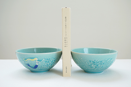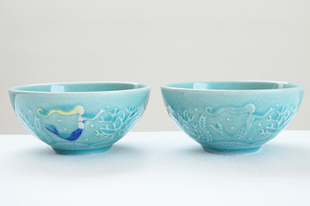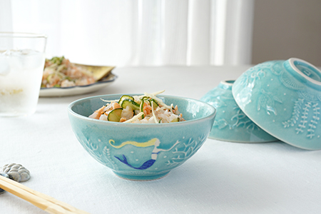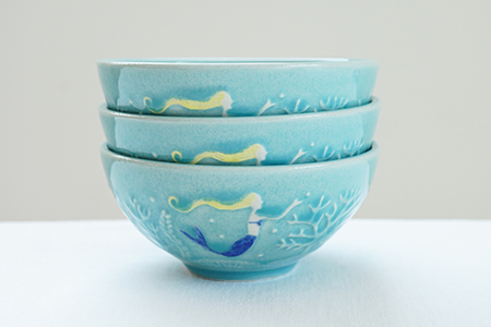 マーメイドや海の生きものたちがぐるりと描かれた「海の飯碗 マーメイドの着彩」。まるで絵本の1ページのような、やさしくてちょっと不思議な世界が広がっています。器をくるっと回すたび、貝がらやスイスイと泳ぐ魚にウミガメ、ゆらゆらゆれる水草が目に入って、ついじっくり眺めたくなってしまいます。ごはんをよそう前から、わくわくさせてくれるような一皿です。