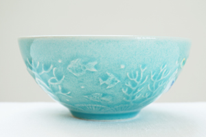 サンゴ礁や色とりどりの魚たちであふれる美しい海の世界観をデザインした、ちょっと小ぶりの飯碗です。凹凸で施した模様をよく見ると、ウミガメに貝やヒトデ、そして長い髪をなびかせたマーメイドの姿も♪裏返した時に見える、高台の周りのフリルのような模様も幻想的です。
