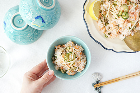 この日、用意したのは鮭ときゅうりの混ぜご飯。生姜や大葉など薬味をたっぷりきかせて、さっぱりとした夏のごはんに仕上げました。