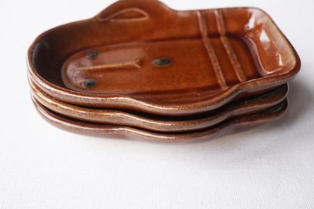 色はツヤのある益子の伝統的な釉薬「あめ色」で仕上げ、目と口には黒く着色を施しました。くりくりとした目に、驚いたような口がとってもチャーミングです♪