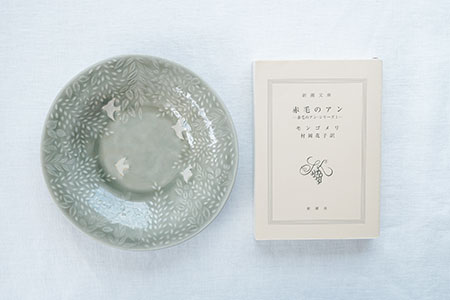 「鳥と雲の皿」から始まった物語。様々な空を悠々と旅してきた4羽の鳥の仲良し親子のシリーズです。この器で飛んでいるのは、青々と葉が茂る森の中。嬉しそうに葉が踊り、鳥たちを歓迎している風景が思い浮かぶ…繊細で素敵なデザインです。