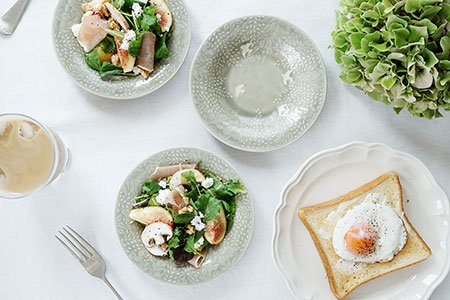 直径16cmほどで少し深さもあるので、サラダやフルーツ、取り皿にもぴったり。この日は「いちじくと生ハムのサラダ」を盛りつけてみました。みずみずしいフルーツの赤紫や葉野菜のグリーンが、お皿の中の森のデザインにもよく合って、ますます爽やかに感じられました。