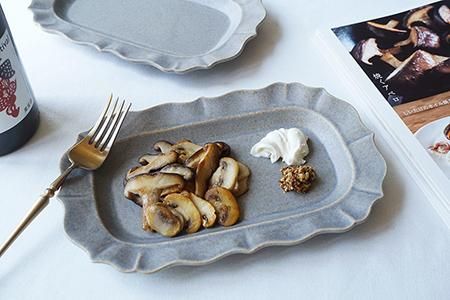 落ち着いたカラーと洗練された「稜花」のデザインで大人っぽい雰囲気をたっぷり感じられるこの「グレージュ(しっとり) 稜花長方皿」は、お酒を愉しむ時間にもぴったりです。きのこが美味しい季節は、料理家の長尾智子さんの「ティーとアペロ」のレシピを真似て、椎茸をオイルでソテーしてから、シンプルにマスタードとチーズを付けて頂くのが定番。さっそくこの器に盛りつけてみると、ワインが似合う一皿に♪