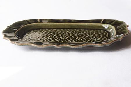 「ベルベットグリーン 稜花長方皿 classic flower pattern」はたたら作りで製作しています。