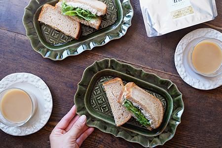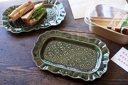 この日は那須に新しくできたKANELBREAD NASUさんへ!天井が高い素敵な店内に種類豊富なパンがずらりと並んでいて思わずウキウキしながらお買い物してきました。選んできたパンはボックス入りの2種類のサインドイッチ。この「ベルベットグリーン 稜花長方皿 classic flower pattern」に1種類ずつを盛りつけるとサイズ感がぴったりな上に、シンプルな大人味のサンドにもよく似合いました♡