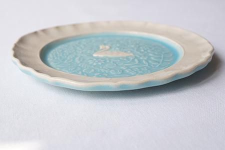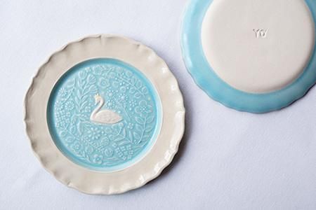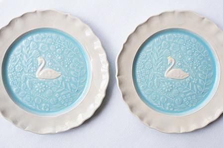 リムは白土の素地に透明な釉薬をかけて落ち着いた白に、そしてプレート部分を「ソーダブルー(しっとり)」で、さらに白鳥は黄色い王冠をつけた白い姿に仕上げてみると…小さな湖にいる白鳥をイメージさせて優美で素敵な一枚になりました。