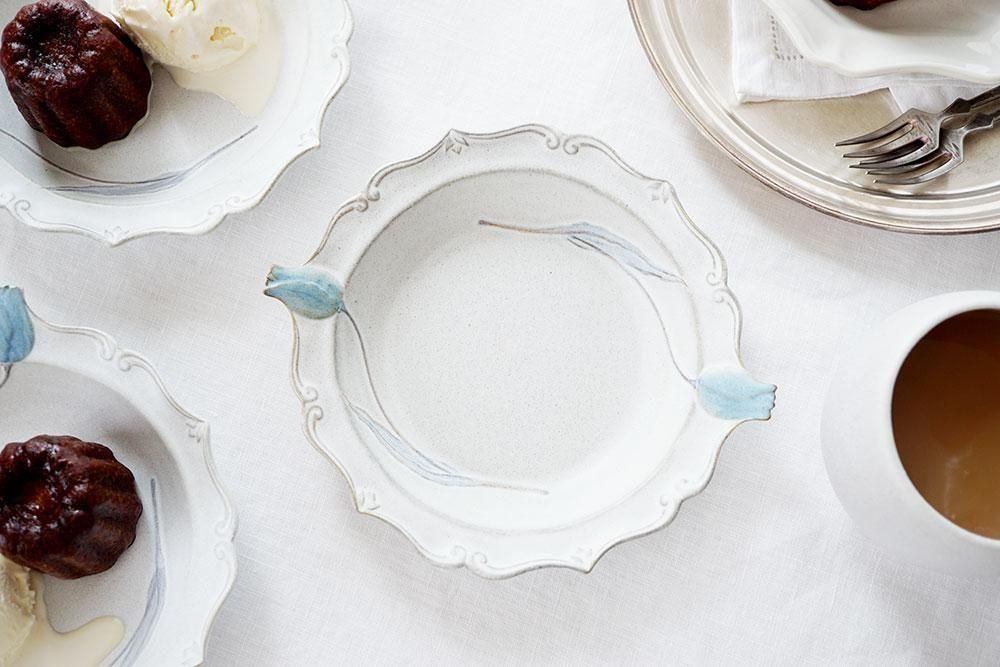 淡くやさしい青いチューリップがデザインされた「チューリップの西洋深皿 青」は、どこかアンティークな風合いが感じられる素敵な雰囲気のある器です。