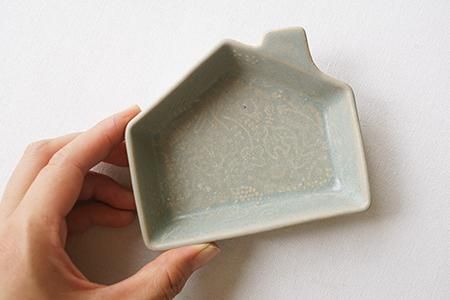 「薄緑(しっとり) 刺繍模様のお家の小鉢」はたたら作りで製作しています。