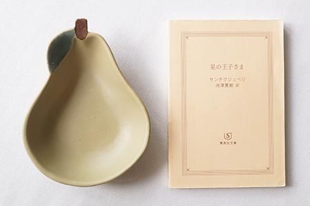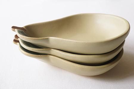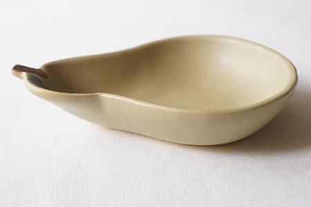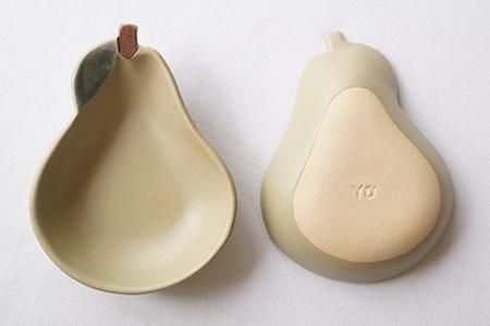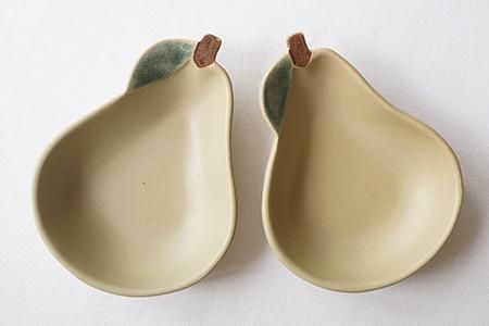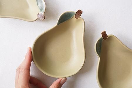 茎と葉っぱのついた洋梨をモチーフにした小鉢です。色は「ピスタチオ」。ツヤのない黄色と緑の中間のような、素朴でやさしい色合いです。さらに茎には茶色、葉っぱにはツヤのある緑の釉で着彩を施しました。ぽってりとした丸みが可愛らしい洋梨の小鉢は、副菜やデザート鉢としてもぴったりのサイズ感です。西洋では梨は「平和」と「希望」という花言葉を持つ果物として愛されているそうです。お友達やご家族の幸せを願う贈り物としてもおすすめです♪