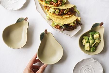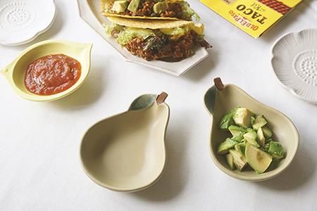 外食でタコスを味わう度にいつか家でも作ってみたいと思いながらも、なかなかトライできずにいたのですが…先日 ”タコスキット” を手にする機会があり、やっと実現させることができたんです。キットに入っていたシーズニングでひき肉を炒め、好きな具材と一緒にサルサソースをのせるだけで簡単に仕上り、いきなりタコスのハードルが下がったような気がして嬉しくなりました。追加でのせたい大好きなアボガドは特別にたっぷりと用意したくて、この「洋梨の小鉢」に。メキシコ料理に洋梨をモチーフにした器を合わせると、それだけで陽気な雰囲気が高まり楽しい気分に! さらにサルサソースは、キットの箱の黄色いカラーに合わせて