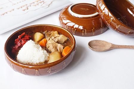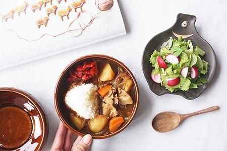 なかなか山登りに行けていなくてうずうずしているところ、ハイジが暮らす山をイメージした模様が入っている「あめ色 山小屋のスープボウル 大」が出来上がり、この器でご飯を楽しめば、ちょっとした山気分を味わえそう!と思ったんです。山関連の施設に行くとよく目にする”山カレー”をまずは合わせてみることに♪ ご飯を山型にしてみると、ザ・山カレー!な感じが出て楽しい気分になりました。