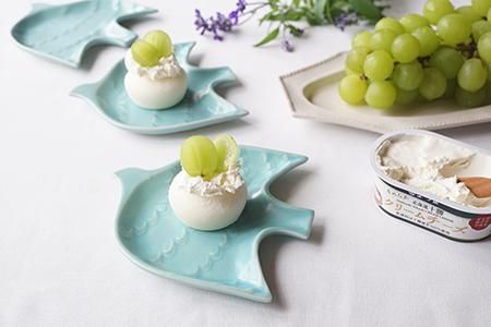 また数客並べてお使いいただくと、鳥たちがテーブルの上を楽しそうに飛んでいるかのような風景が広がりより華やかでおすすめです。ちなみにロッテさんのものは、雪見大福→マスカルポーネ→フルーツの順番で盛りつけるレシピだったのですが、この日はクリームチーズで代用してアレンジ。マスカルポーネとクリームチーズどちらも美味しそうなので、次に作る時には2種類のチーズを用意して食べ比べしてみようかなと思っているところです♪