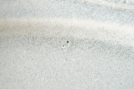 色は『フロストグリーン』。白に近い淡いグリーンという感じのニュアンスのある色合いです。ざらざらとした質感で、まるでfrost(フロスト)=霜が降りたかのようなぽつぽつとした細かい釉薬の結晶が全体に見られ、穏やかで静寂を感じる雰囲気です。結晶の出方は焼成温度によって変化するので、発色は様々です。繊細で複雑な表情が楽しめる釉薬で、一客一客で違う表情・個性を楽しんでいただける方向けの器です。「きれい」とか、「均一な色合い」がお好みの方には、おすすめできませんので予めご了承ください。