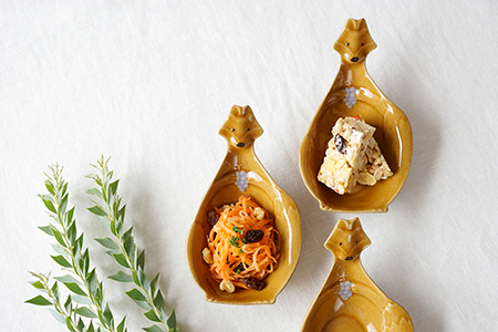 変わった形のように見えますが、器として使える部分は楕円の小鉢という感じで、これまた意外と量も入るんです。レーズンを入れたキャロットラペは、1人分がちょうどよく収まりました。このままワンプレートにのせても、きっとかわいいだろうなぁ♪
