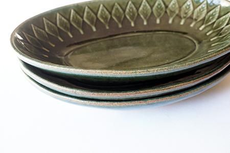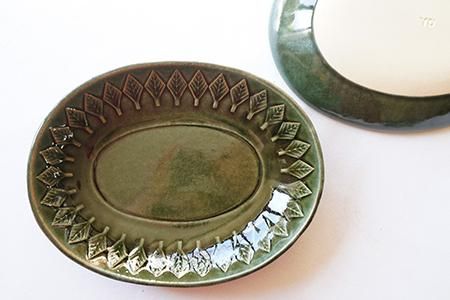 「ベルベットグリーン ツリーパターンの楕円鉢」はたたら作りで製作しています。