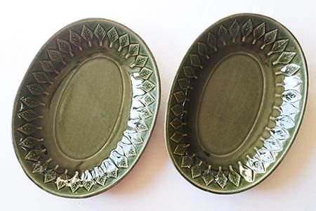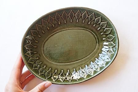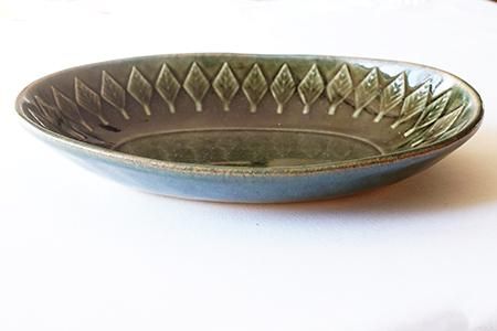 ベルベットグリーン ツリーパターンの楕円鉢(貫入/釉ヒビあり)<オーブン使用可>