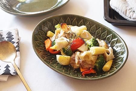 以前、ご近所さんが夕食に招待してくださった時に用意してくれた根菜のオーブン焼きがとっても美味しかったんです。色々な種類の根菜が使われていて彩り豊かで、季節の味わいがして、記憶に残るお料理のひとつになりました。それからというもの、たまに根菜のオーブン焼きを真似て作っているのですが、この「ベルベットグリーン ツリーパターンの楕円鉢」との相性も抜群でした! 光沢感のあるベルベットグリーンの木々の模様に包まれたお料理がまるで、実りの季節を連想させ、ひとつの風景かのように見えて、思わずはにかんでしまうくらい満足な一皿になりました。