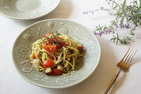 少し前に行ったイタリアンレストランで食べたタコがたくさん入ったバジルパスタがとても美味しくて、あの味を家でも再現させたい!と思いトライしてみることに♪頑張って再現したパスタを「薄緑(しっとり) 花図鑑の深皿」に盛りつけてみると、誕生花に飾られてとても華やかで、大満足な見た目に仕上がりました。お店のようなメニューに、贅沢感のある器が相まって、非日常感たっぷりで、まるでレストランで味わっているかのような感覚に* また真鍮のカトラリーとの相性も素敵でした♪
