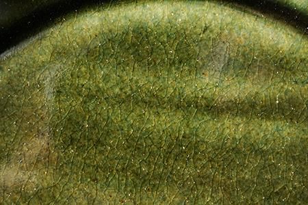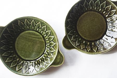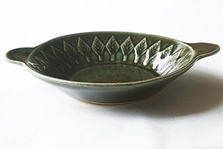 ベルベットグリーン ツリーパターンの手付き丸皿(貫入/釉ヒビあり)<オーブン使用可>