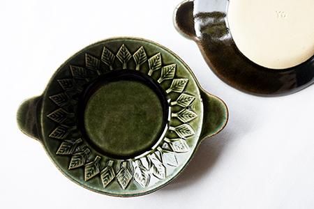 だんだん寒さが増してくると、熱々のオーブン料理が恋しくなりますよね♡ 油染みなどの汚れが目立たないツヤのある深緑色の「ベルベットグリーン」を施した手付き丸皿のオーブンウェアをつくりました♪