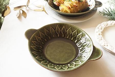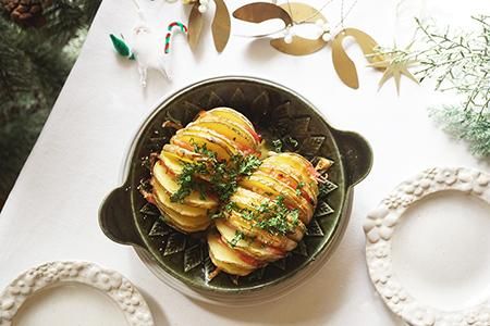 寒い日にはオーブン料理を作ってハフハフしながら熱々を味わいたいもの。休日には朝食にも簡単熱々メニューをひとつ♪!この日はハッセルバックポテトを。「ベルベットグリーン ツリーパターンの手付き丸皿<オーブン使用可>」にじゃがいもを2つ並べ、ベーコンだけでなくチーズをたっぷり間に挟んで、子どもたちが大好きな味に仕上げてみました。この器で作ると、まるで料理がツリーに飾られているかのようで気分が上がる一品に♪