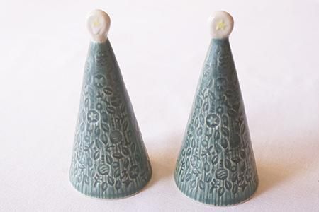 色は天然灰と銅を組み合わせて作った「銅緑釉」、そしてトップは白く、星の部分には黄色い着彩をひとつひとつ手作業で入れています。