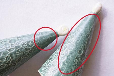 焼き色や模様の出方は一客一客で異なり、星の部分は塗りムラが感じられたり、色が薄いものがあります。また細くなっている部分、重なりの部分は模様がぼんやりとしています(写真下2枚目)。お任せ発送となりますので、予めご了承ください。また中は空洞になっています(写真下3枚目)。