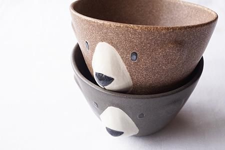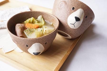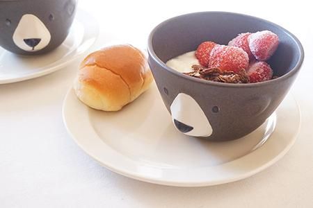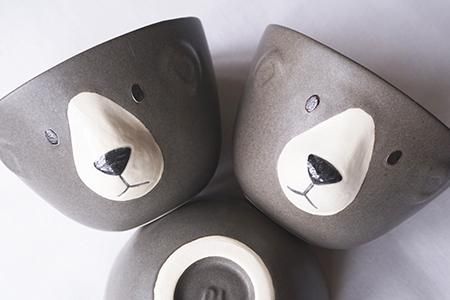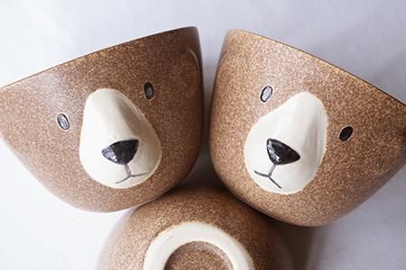 大きめサイズのスープボウルの側面にくまさんの顔のデザインを入れました。鼻のところが立体的に盛り上がった作りになっていて、可愛らしい印象に仕上がっています。